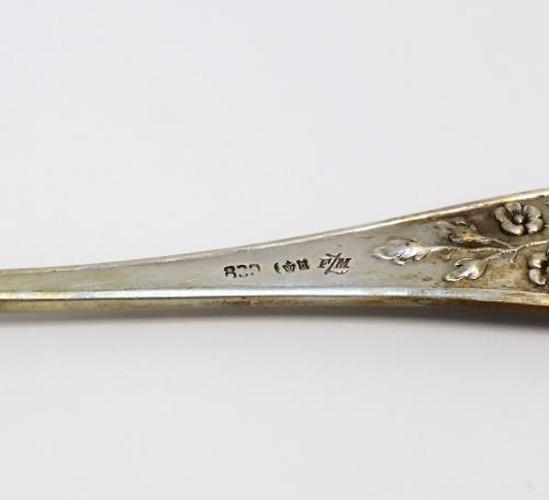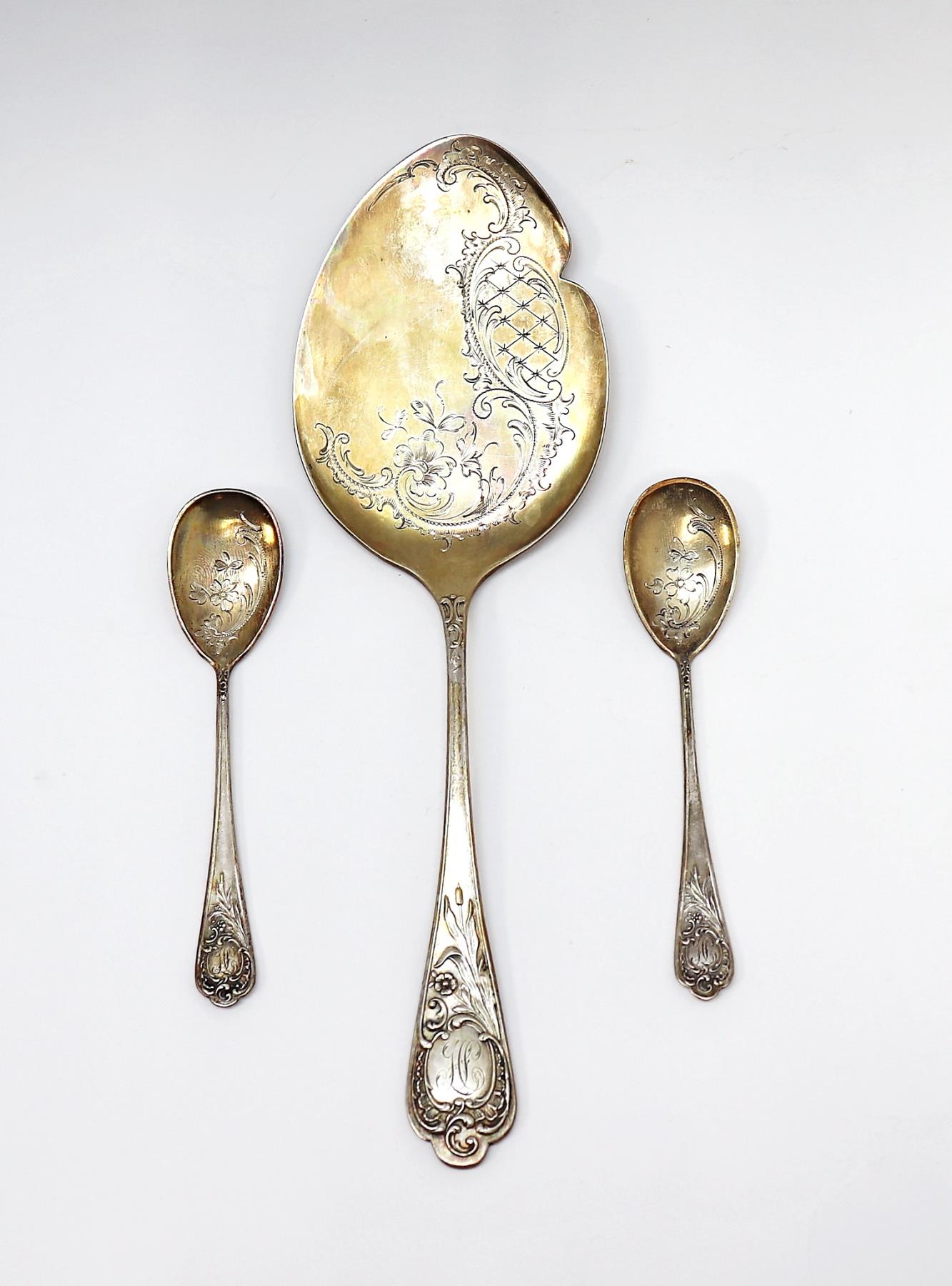800/1000 finomságú ezüst, német, XIX. sz. második fele, 1 db kínáló kanál (21,3 cm), 12 db kiskanál (11 cm), jelezve korabeli német fémjellel, 800 számmal, FZM mesterjellel, eredeti dobozában, ezüst súly 225,3 g